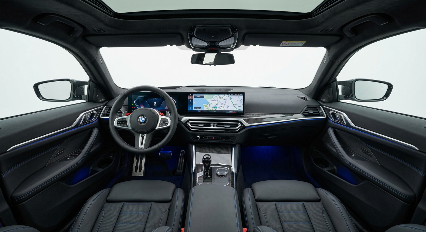 Kabinen i BMW i4 M50 er domineret af det BMW Curved Display, der kombinerer et 12,3-tommer digitalt instrumentpanel med en 14,9-tommer central touchskærm i én buet glasflade. Systemet kører iDrive 9, der er markant hurtigere og mere intuitivt end tidligere generationer.